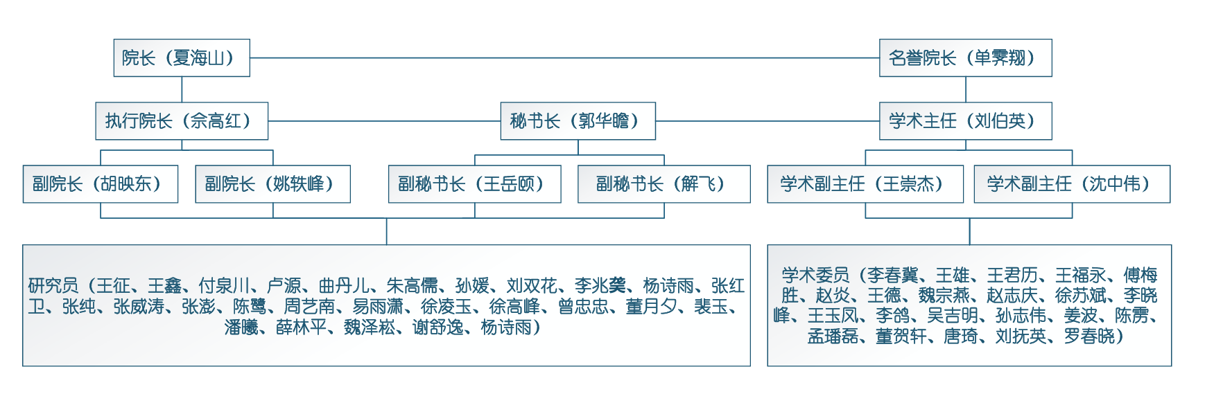 后入 交通文化及遗产保护研究院挂靠后入 管理,夏海山担任院长,单霁翔任名誉院长,刘伯英、王崇杰、沈中伟等任学术主任和副主任,现有研究成员31人,学术委员22人。组织架构如下: